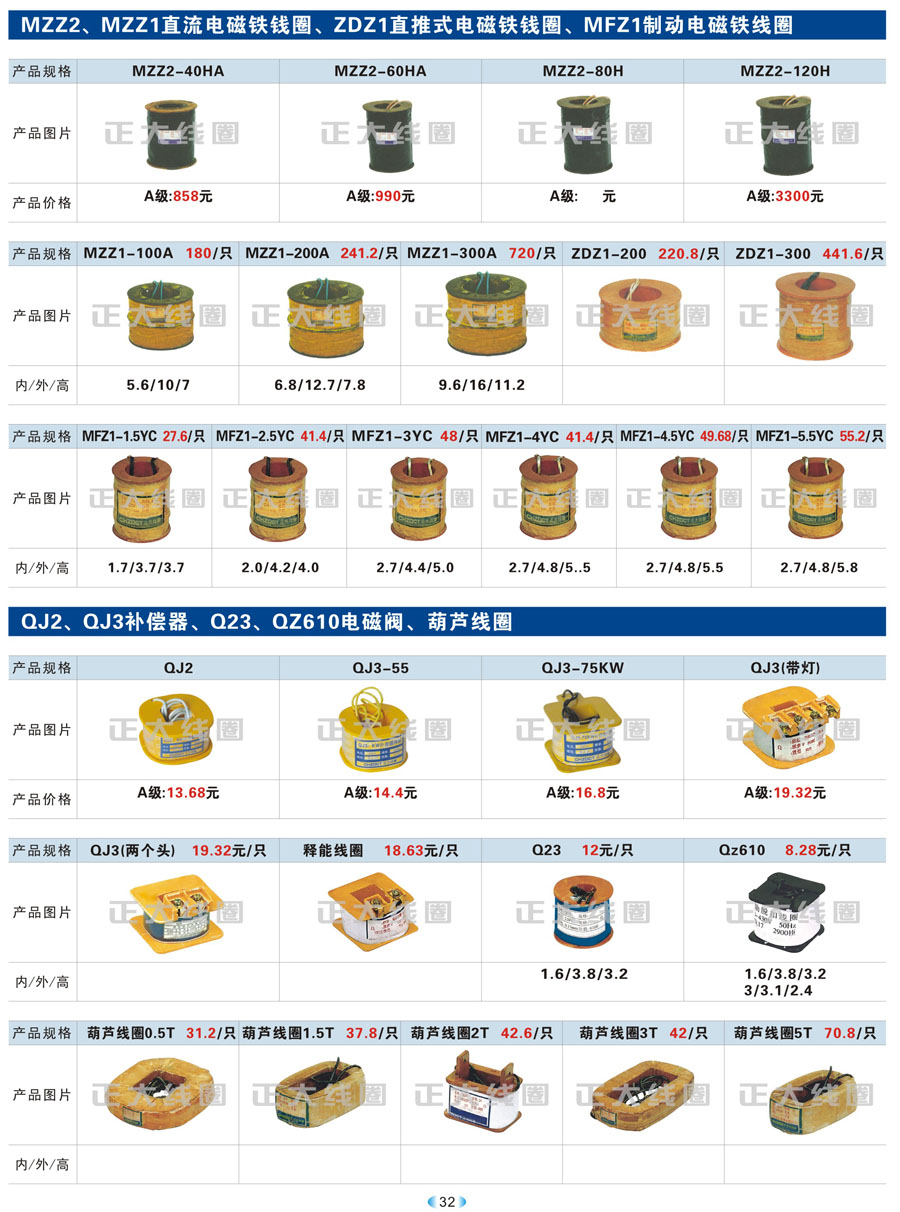 MZZ2、MZZ1直流电磁铁线圈、MZD1直推式电磁铁线圈、MFZ1制动电磁铁线圈、QJ2、QJ3补偿器、Q23、QZ610电磁阀、葫芦线圈 ↩